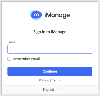 Once iManage is enabled in Legal Forms users will get the option to sign in to iManage after they have logged in to Legal Forms. They will be redirected to the iManage login screen where they must enter their iManage credentials.