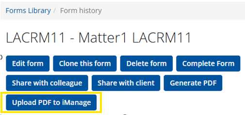 When creating a new form in Library or Hub, users will be redirected to the iManage screen where they can select a folder within iManage to save the form to. Initially it will save a a deep link but once the forms is completed and the PDF generated, there is an option to upload to iManage from Form History.